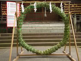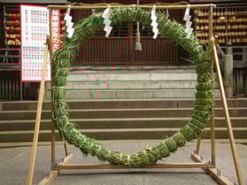 大祓(おおはらい)とは毎年6月、12月の年二度、今日でも宮中を始め広く全国の神社にて行われている行事です。特に6月斎行のものを“夏越大祓(なごしおおはらい)”と言い、当宮にて6月30日に斎行するにあたり、当宮境内にて“茅の輪くぐり”を執り行います。